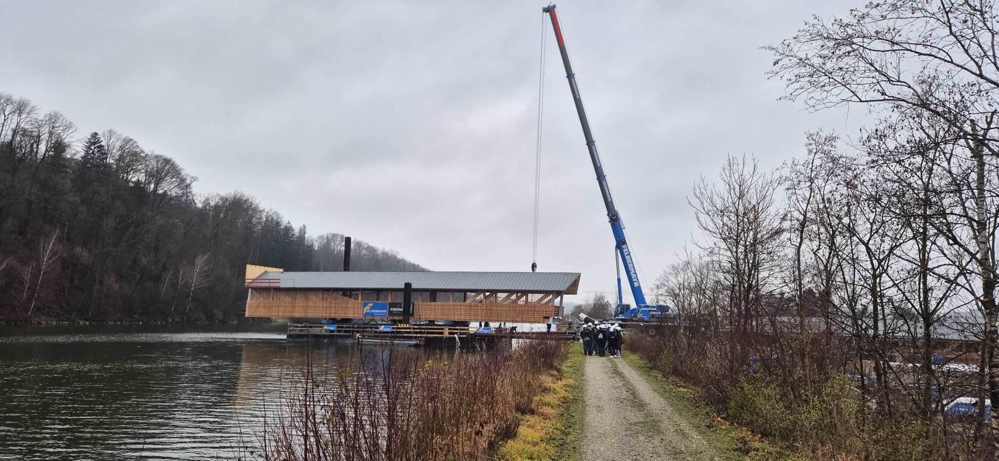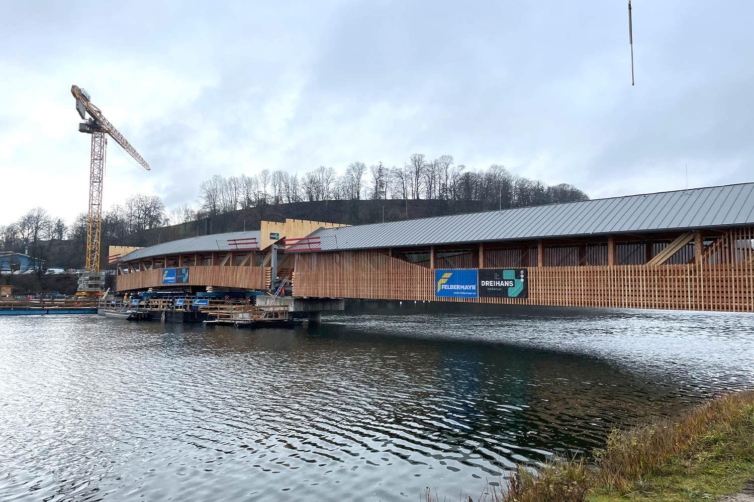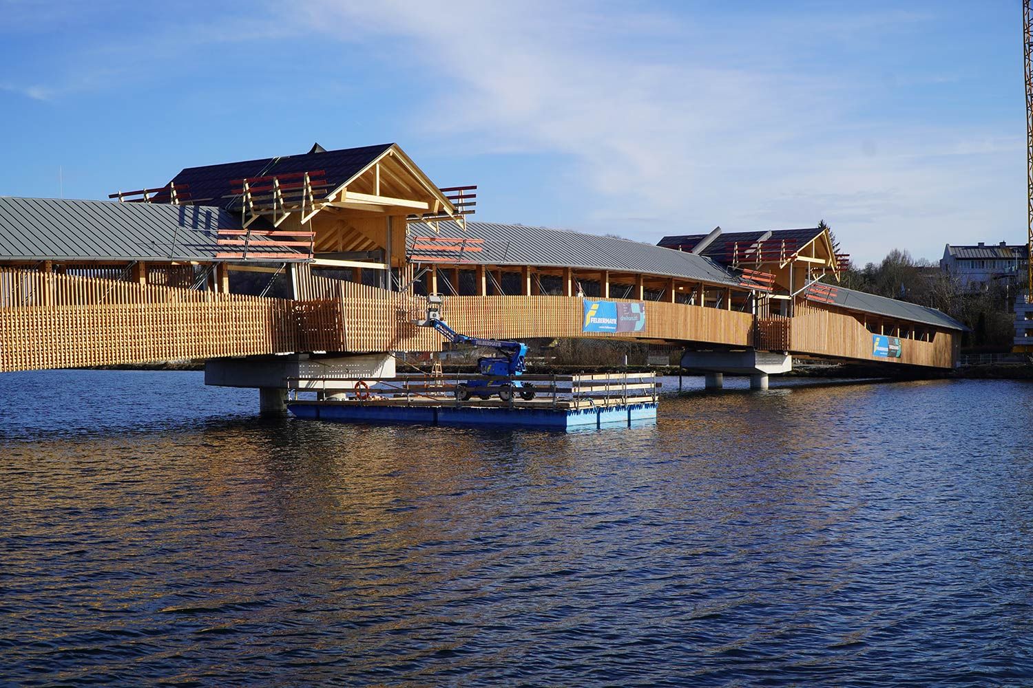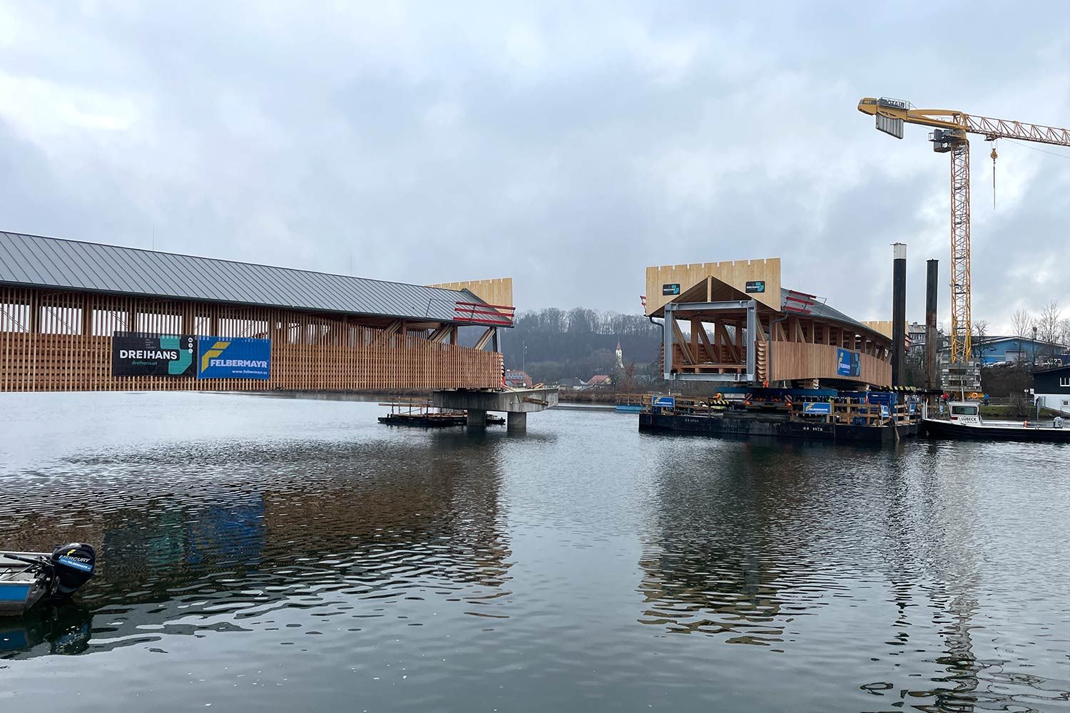 Mit dem Einschwimmen und Versetzen von drei Hauptteilen einer neuen Geh- und Radwegbrücke auf ihre Lager erfolgte am 9. Dezember 2024 in der Stadt Wels (Oberösterreich) die spannendste Phase der Brückenmontage über die Traun. Die Traun ist ein rechter Donau-Zufluss, der von Traunsee und Attersee gespeist wird. Die überdachte Holz-Fachwerkbrücke wird im kommenden Frühjahr zur Nutzung freigegeben. Sie verbessert die Verbindungen zwischen Wels und der Gemeinde Schleißheim, stellt einen Lückenschluss im Radwegenetz dar und ermöglicht eine neue überregionale Nord-Süd-Radverbindung.