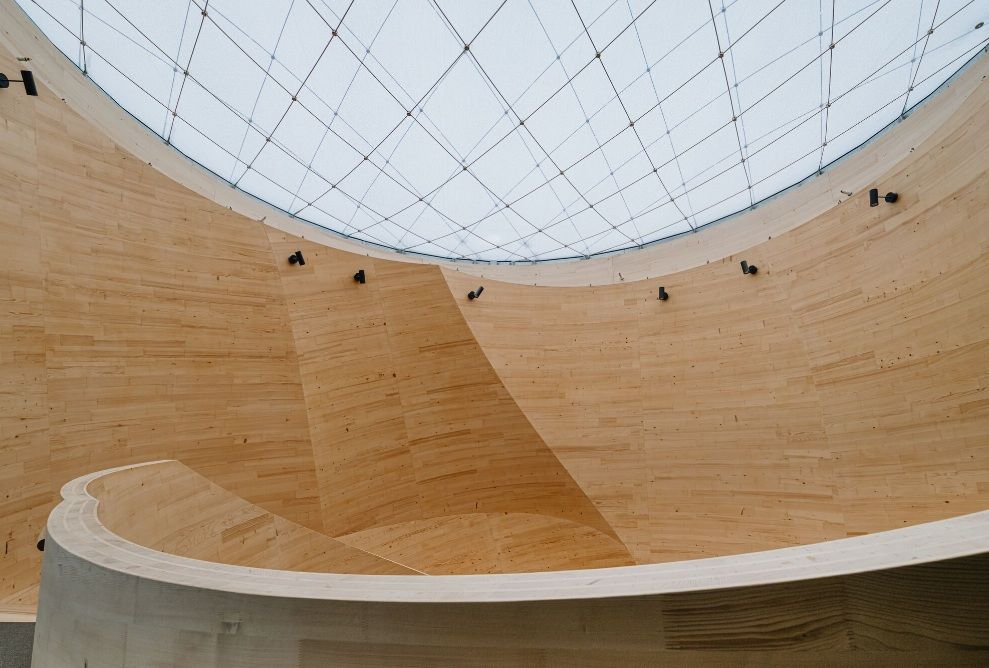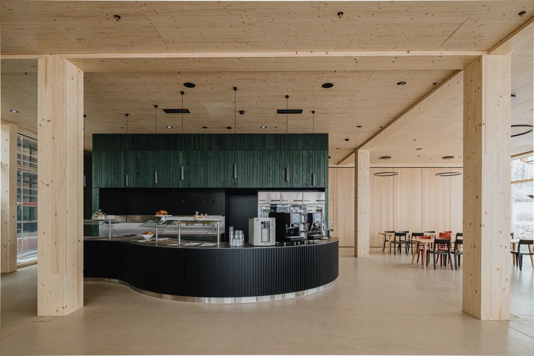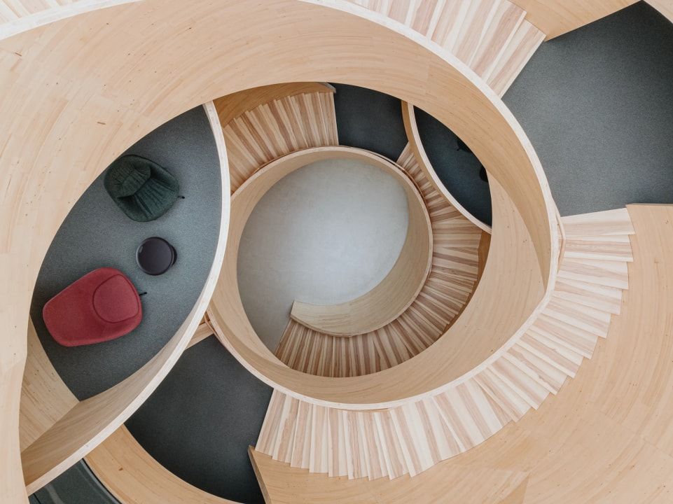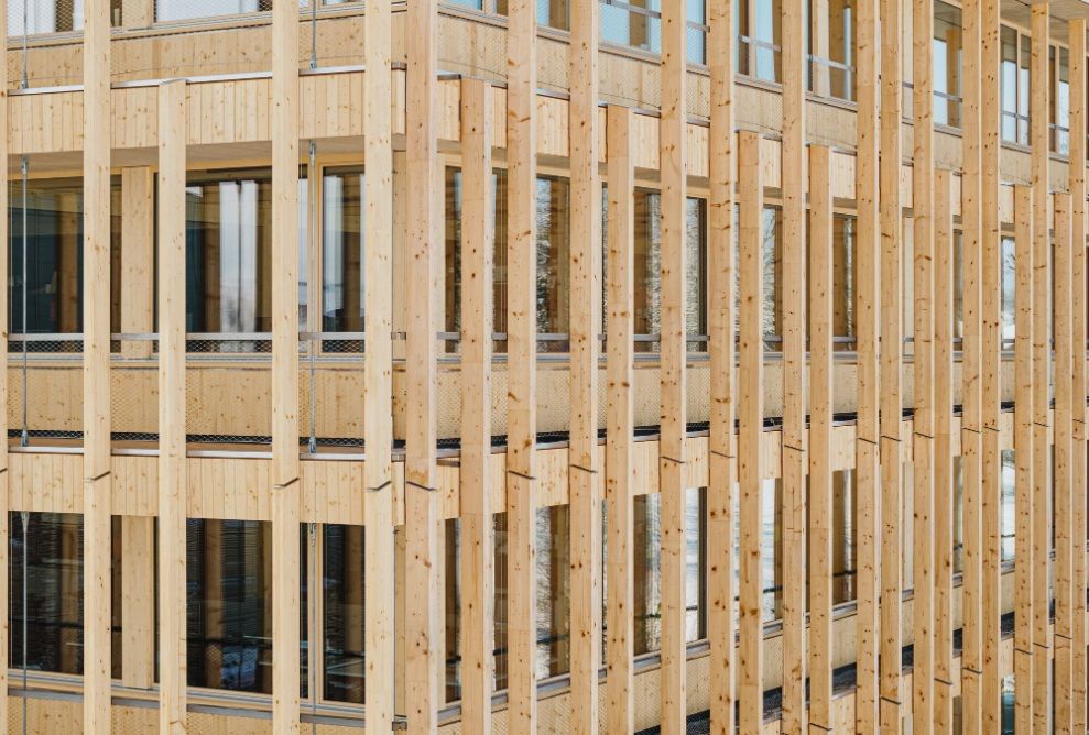 Herzstück des fünfstöckiger Holzskelettbaus mit HBV-Decken ist das Foyer mit einer FreiformHolztreppe aus gebogenem Brettsperrholz, das Blumer Lehmann gemeinsam mit dem Institut für Computerbasiertes Entwerfen und Baufertigung der Universität Stuttgart (ICD / Prof. Achim Menges) entwickelt hat. Als Statikingenieure für das zentrale Treppenhaus (Atrium) fungierten SJB Kempter Fitze AG. Es verbindet digitale Planungs- und Fertigungsmethoden mit handwerklich-industriellem Holzbau - eine sehenswerte architektonische Synthese. Sie macht die Möglichkeiten des traditionellen Werkstoffs Holz für künftige Projekte räumlich erlebbar. Für Tageslicht sorgt ein rundes Oberlicht mit 8,50 m Durchmesser über dem Atrium.