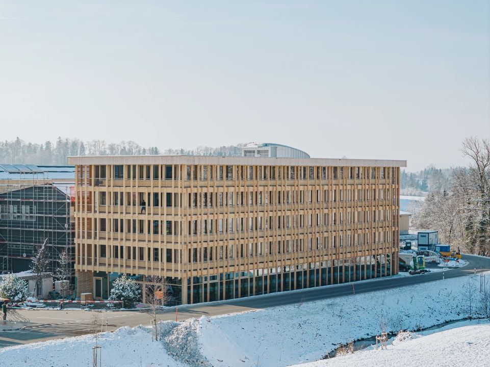 Die Schweizer Holzbaufirma Blumer Lehmann hat ihr neues Büro- und Empfangsgebäude auf dem Erlenhof bezogen, dem Firmensitz und Produktionsstandort in Gossau (Kanton St. Gallen). In zweijähriger Bauzeit ist dort ein moderner, mit möglichst einfacher Haustechnik ausgestatteter Holzbau entstanden - mit einem hohen Anteil an Eigenleistung. Blumer Lehmann war gleichzeitig auch GU, Tragwerksplaner und ausführendes Holzbauunternehmen.