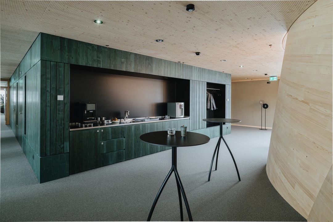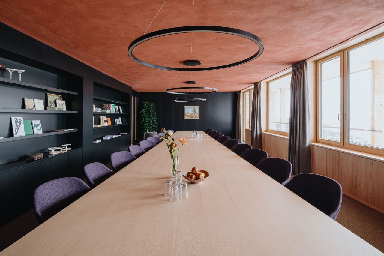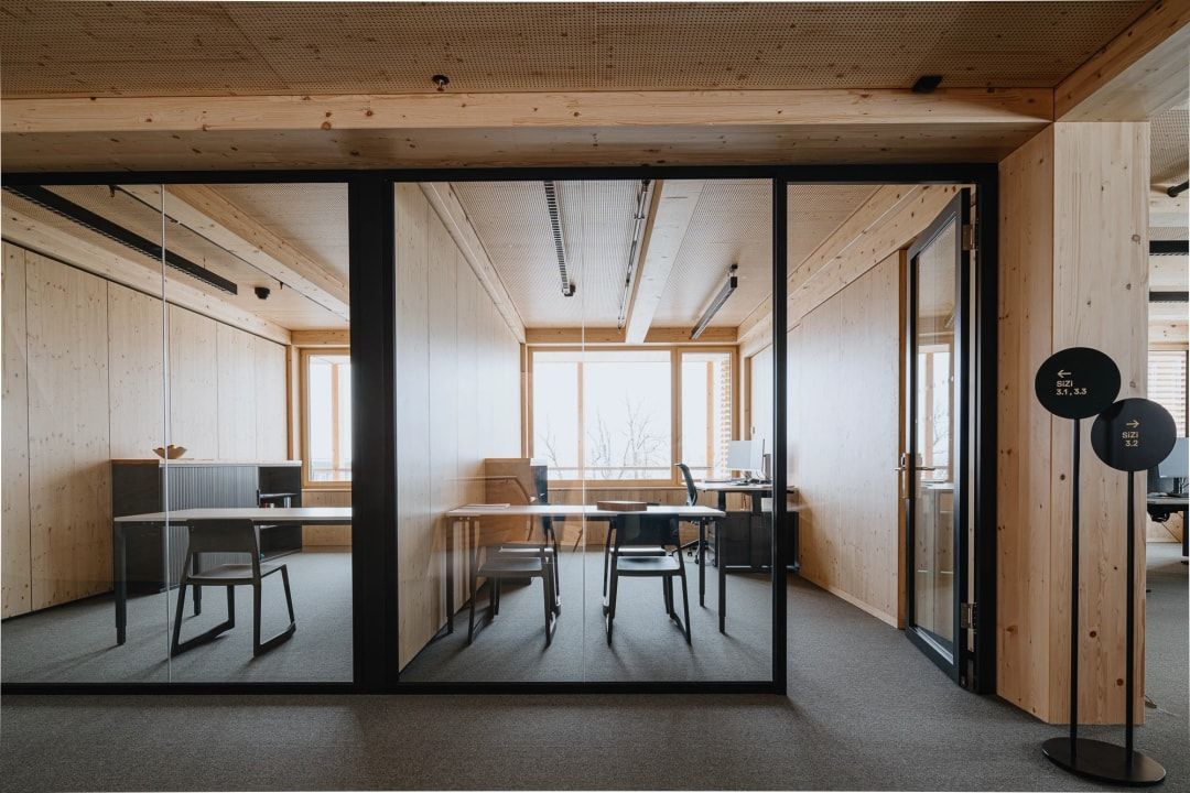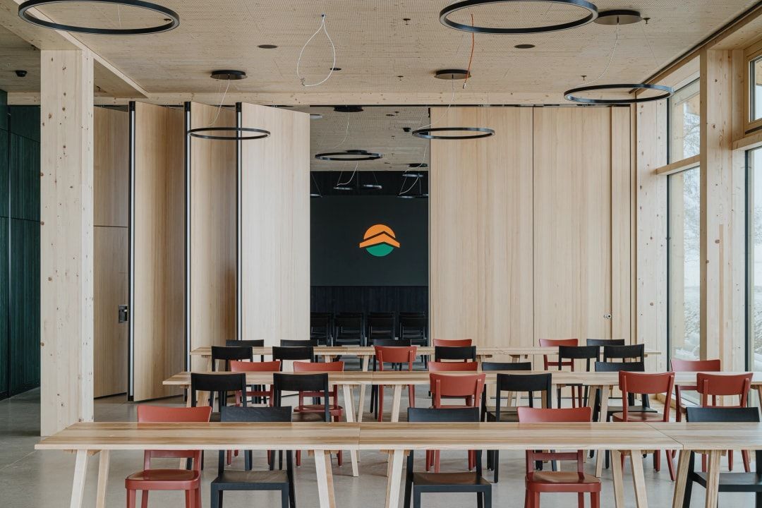 Im Bürohaus sind 180 Büroarbeitsplätze eingerichtet, es bietet im Erdgeschoss außerdem Platz für eine Cafeteria mit Terrasse und Veranstaltungs- und Eventräume. Im 2. Obergeschoss verbindet eine Brücke den Neubau mit der benachbarten Produktionshalle. Die Büroflächen erstrecken sich entlang der Außenfassaden, während sich die Besprechungs- und Rückzugsräume, Teeküchen und Garderobennischen um den Beton-Erschließungskern gruppieren. In den flexiblen Büroetagen verbessern Lehmwände das Raumklima, sie dienen als thermischer Speicher, unterstützt durch Holz-Akustikdecken und einen Wollteppichboden.