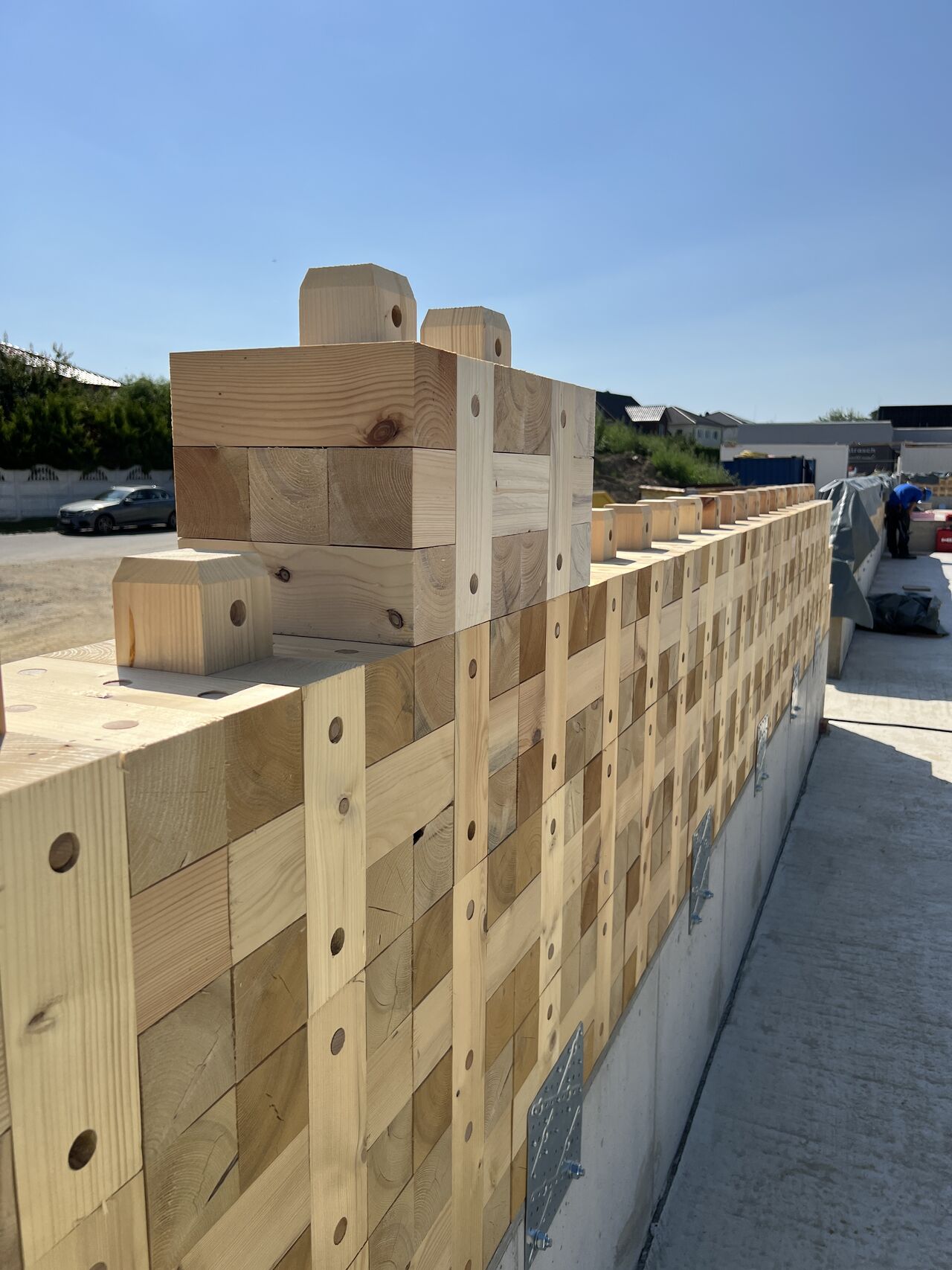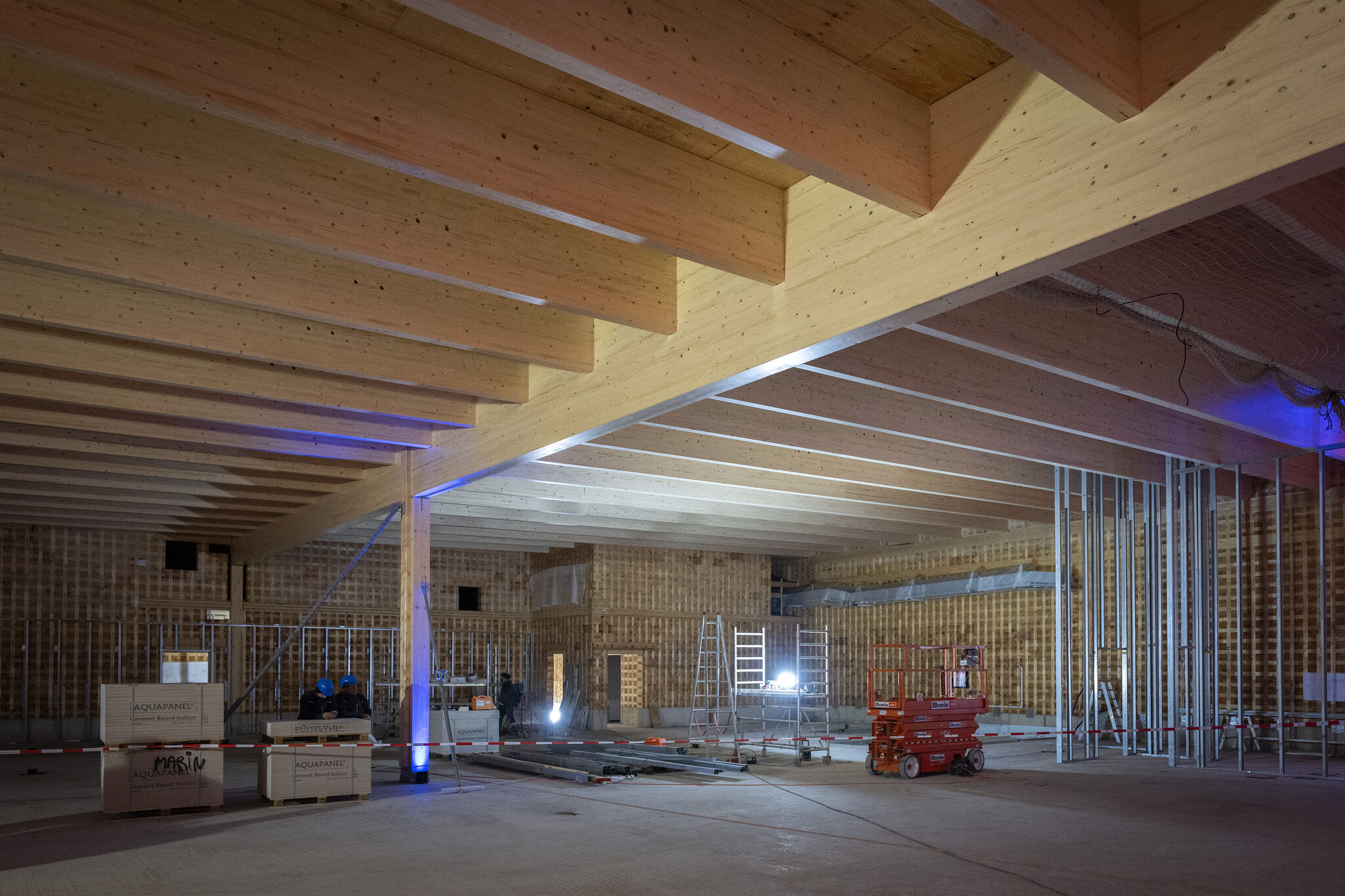Die Grundfläche des ebenerdigen Marktes ist 60 x 40 m, die Bauhöhe beträgt 7 m. Die bis zu 4,90 m hohen tragenden Innen- und Außenwände wurden bei diesem Projekt mit 25-cm-Triqbriq-Elementen aus dem Werk in Tübingen ausgeführt, nicht tragende Innenwände in normaler Trockenbauweise. Damit das Holz trocken blieb, wurde in der Bauphase ohne Dach mit Abdeckplanen gearbeitet. Das Flachdach ist durch den Einbau eines zentralen Hauptbinders mit BSH-Nebenträgern weitgehend freitragend, im Innenraum des Marktes sind nur zwei BSHStützen. Die Dachuntersicht bilden Brettsperrholzelemente, die mit 30 cm Mineralwolle gedämmt sind.