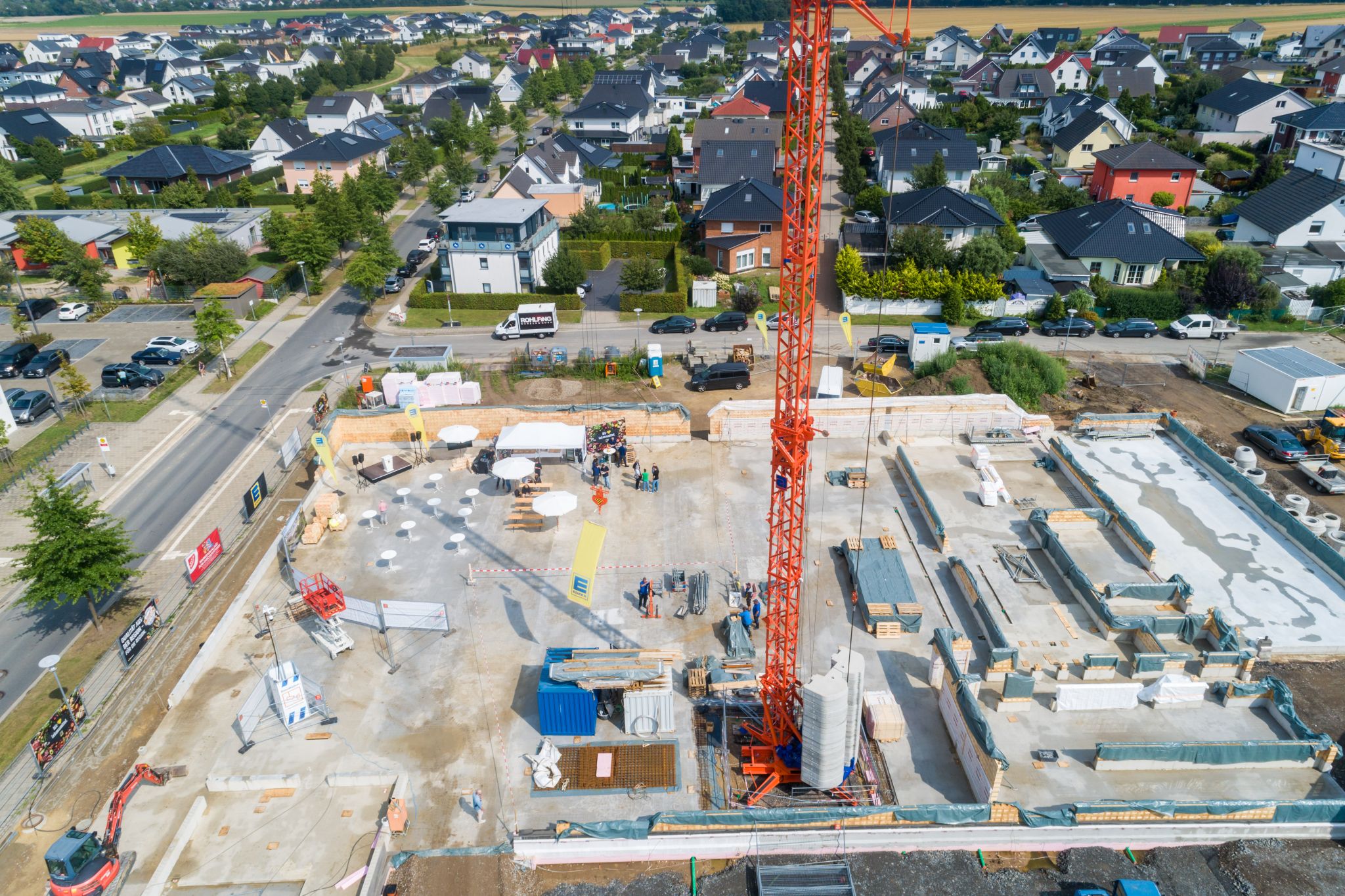 Im Juni letzten Jahres war mit den Erdarbeiten begonnen worden, der Holzbau folgte ab Ende Juli. Richtfest war am 28. November. Als Generalunternehmen im Edeka-Auftrag fungierte Industriebau Haldensleben aus Sachsen-Anhalt, die einen Entwurf der Braunschweiger Architekturbüros Klaassen – Uhde umsetzte.