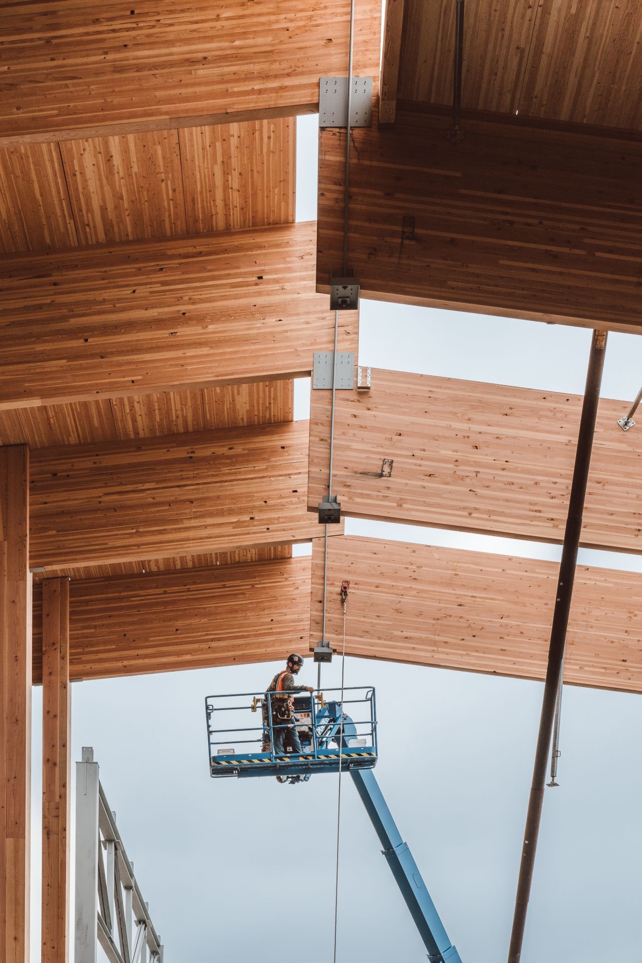Beim Bau der Independence Hall wurden knapp 18.000 m² CLT-Dachpaneele, 240 BSH-Stützen (10 bis 14 m lang), 260 BSH-Leimbinder (27 bis 34 m lang) und in den Außenwänden knapp 7.000 m² Sandwichplatten (SIP-Technologie) verbaut. Die Brettschichtholz-Elemente lieferten die Timberlab-Werke in Swisshome und Drain (früher American Laminators), die CLT-Elemente das Timberlab-Werk in Portland. Das verwendete Holz (Douglasie) kommt überwiegend aus Oregon.