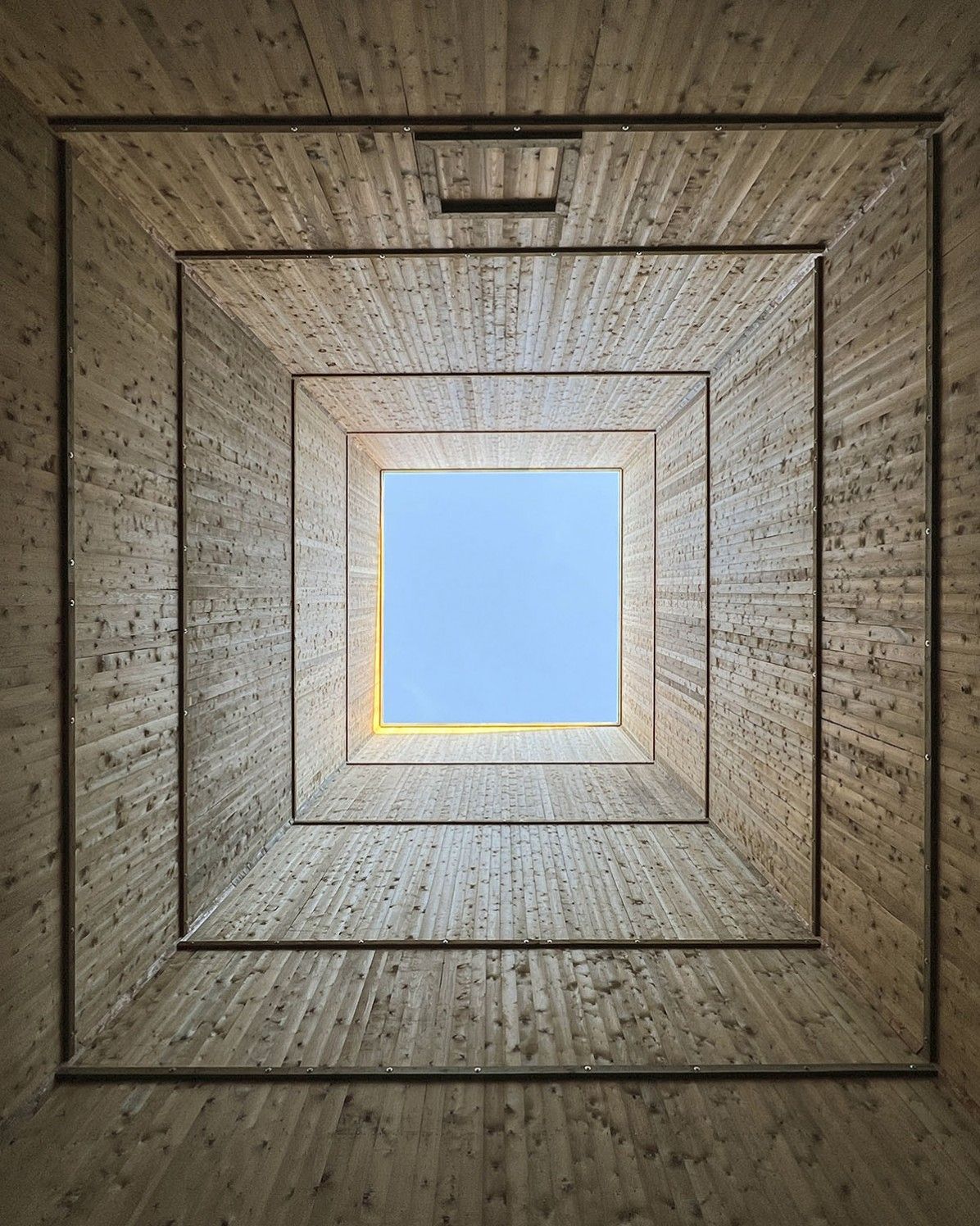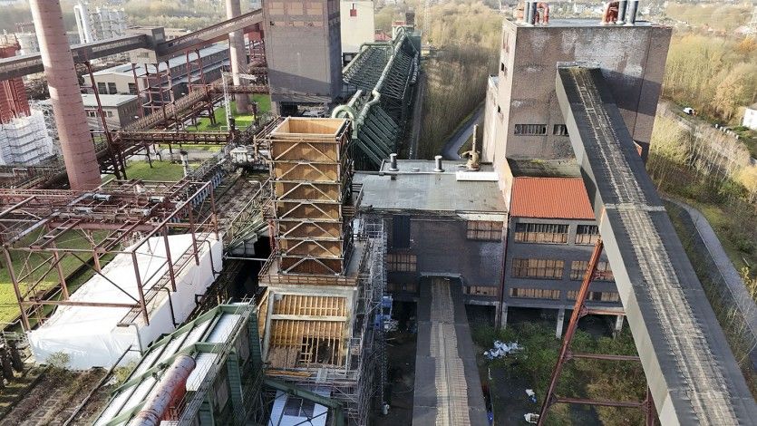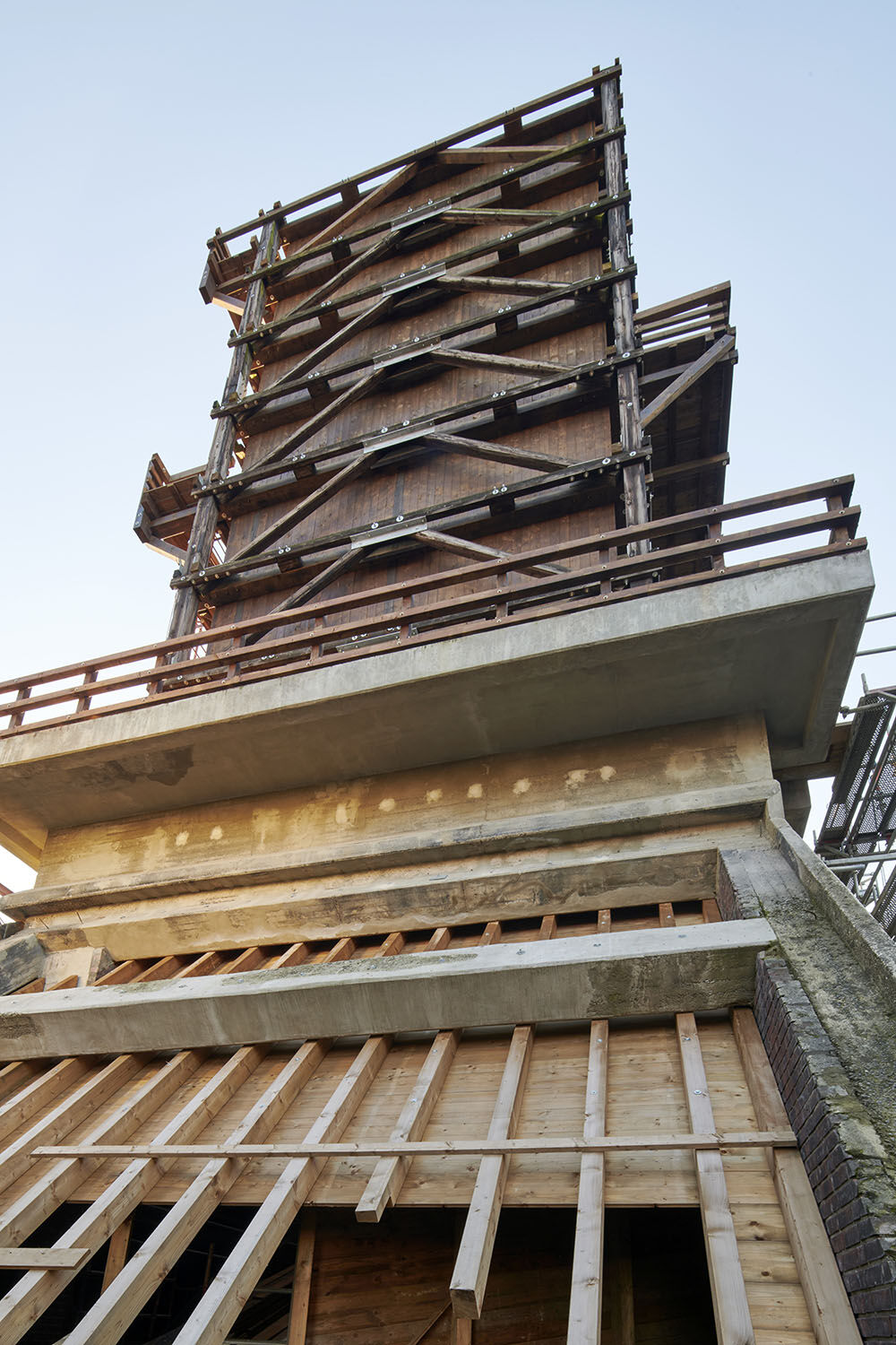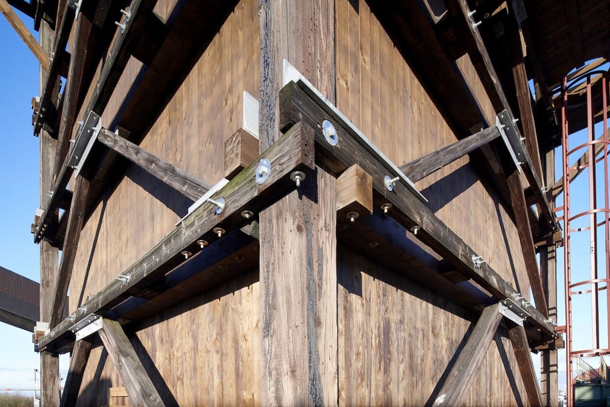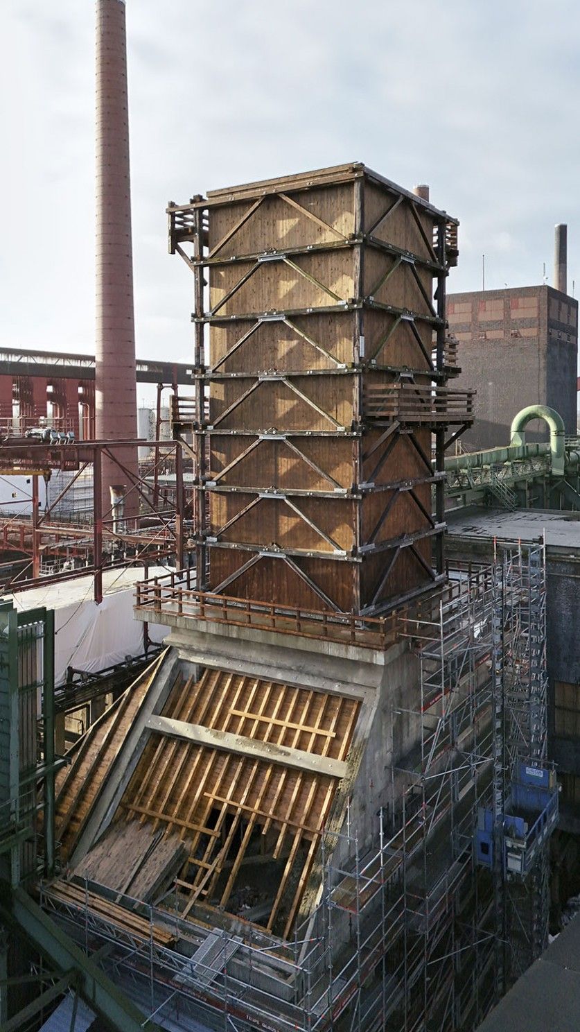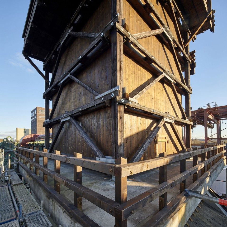 Beton- und Stahlfachwerkquader kontrastieren mit Schornsteinen, Rohrleitungen und Anlagenbestandteilen, aber um dem Verfall der Anlagen auf dem 50 ha großen Kokereigelände Einhalt zu gebieten, muss ständig saniert werden. An ein paar wenigen Stellen trifft man auf Holzbau, z.B. an den Koks-Löschtürmen. Der 1971 errichtete Löschturm Mitte wurde im vergangenen Jahr im Auftrag der Stiftung Zollverein denkmalgerecht grundsaniert. Er diente gemeinsam mit den Löschtürmen Ost und West dem Ablöschen von Koks. Der Koks aus den Öfen wurde in Löschwagen gedrückt und auf dem Löschgleis unter die Löschtürme gefahren. Das dort installierte Rohrleitungssystems löschte den Koks mit Wasser, der aufsteigende Dampf wurde mittels einer hölzernen Löschhaube eingefangen und dann in den Löschturm (ein 18 m hohes Betonbauwerk) und den darauf stehenden, 17 m hohen Holzschlot abgeleitet.