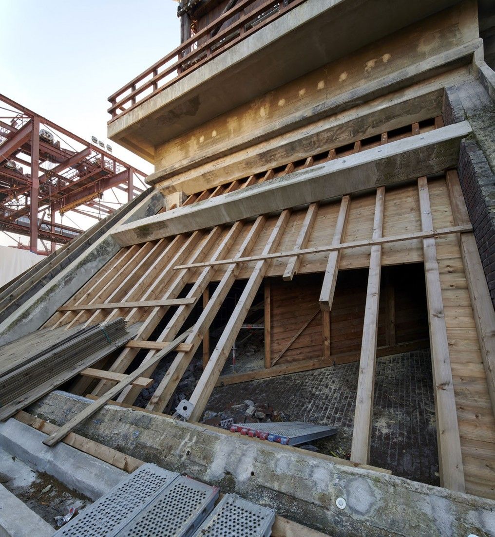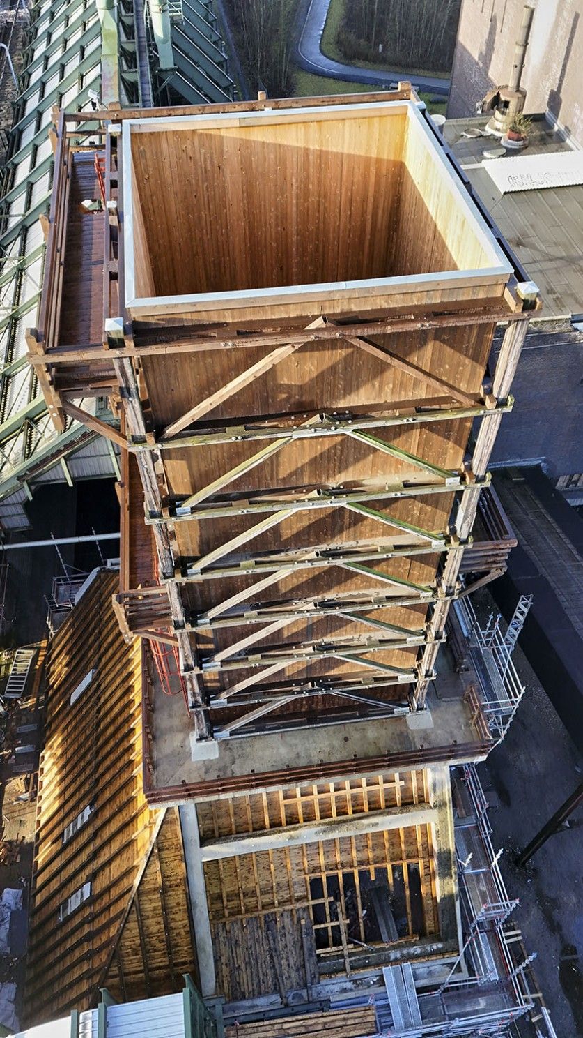 Die Sanierung wurde von Böll Architekten aus Essen geplant und koordiniert. Die wegen akuter Einsturzgefahr bereits 2020 abgebrochene Löschhaube wurde originalgetreu als Pfettendachkonstruktion neu errichtet. Am Tragwerk des Schlotes aus vier Vertikalstützen mit horizontalen und diagonalen fachwerkartig angeordneten Streben wurden geschädigte Balkenteile und alle Bolzen ausgetauscht sowie geschädigte Knoten ertüchtigt und verstärkt. Schließlich wurde die innenliegende Verschalung neu aufgebracht. Von der beauftragten Holzbaufirma Haveloh GmbH aus Ahaus wurden insgesamt 55 m³ kd-imprägniertes Holz (KVH) verbaut (KVH und 850 m² Brettschalung). Eine besondere Herausforderung war die denkmalgerechte Instandsetzung der Knotenpunkte ohne Demontage der Balken. Das Holz wurde mit „Korasit KS2“ von Kora Holzschutz behandelt. Die Tragwerksplanung lieferte HEG Beratende Ingenieure aus Düsseldorf.