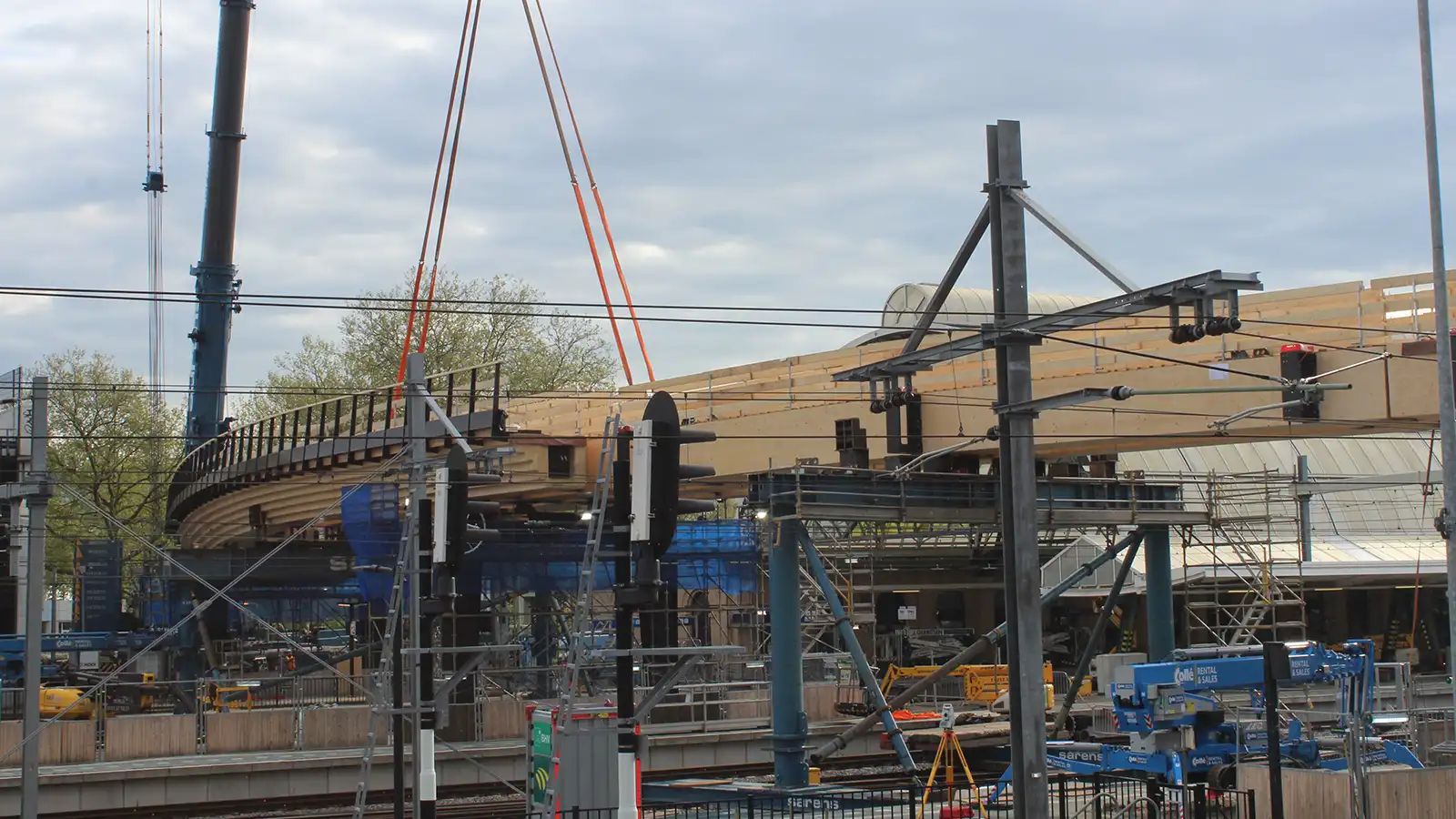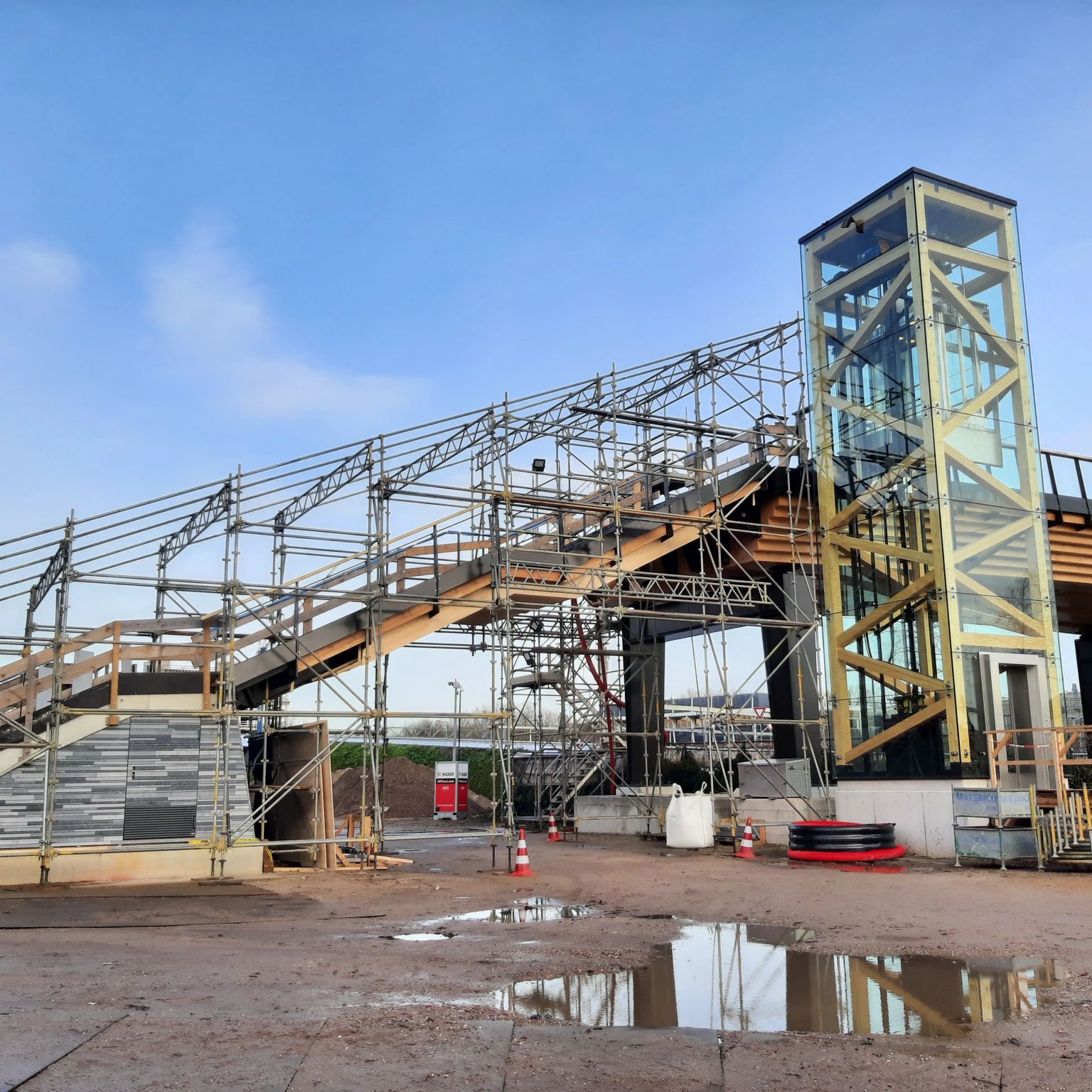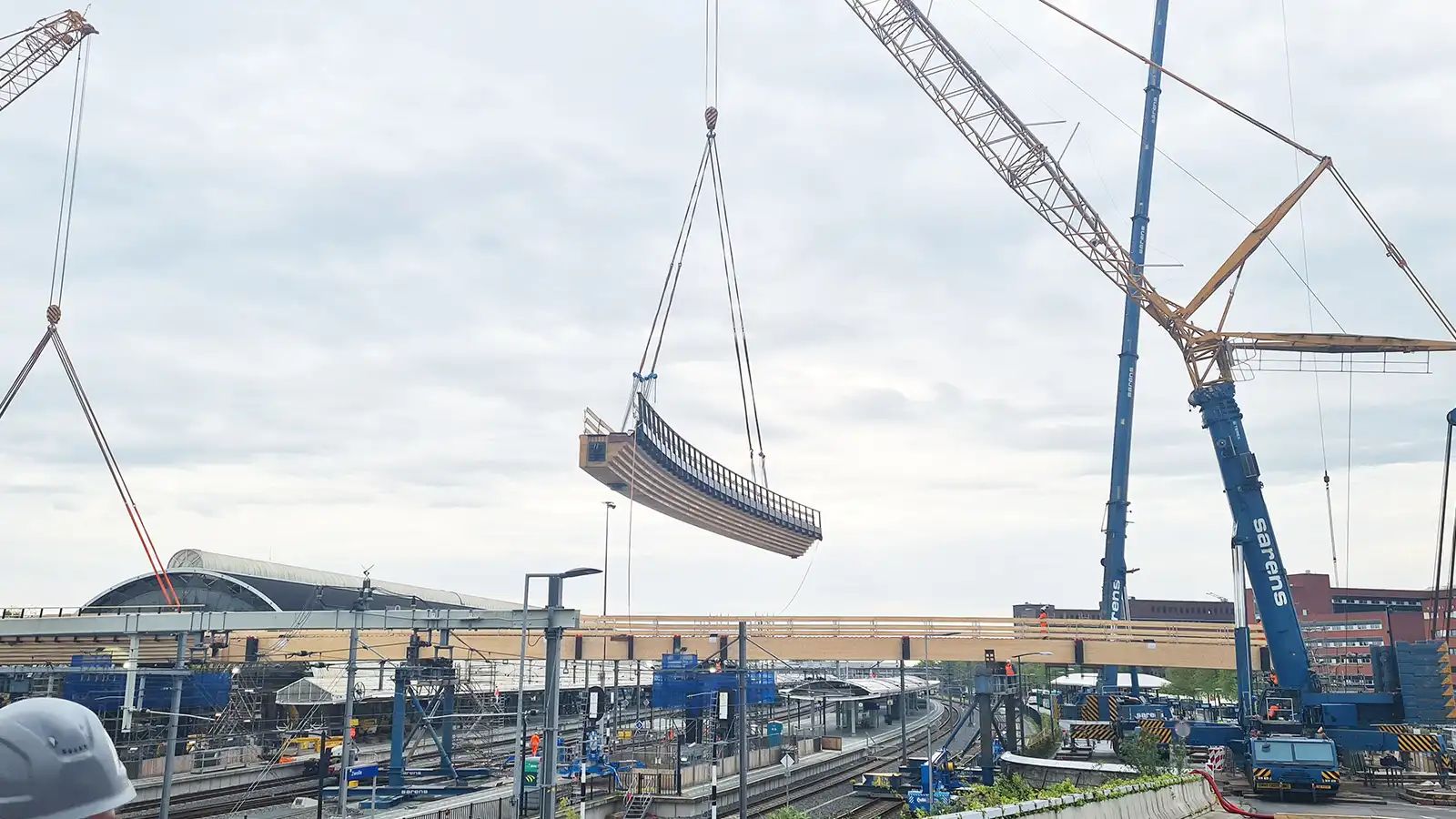 Die Baufirma Dura Vermeer hat zum Jahresende 2024 neue Fotos vom Bahnhofsbrückenprojekt in Zwolle (Niederlande) veröffentlich. Anfang 2025 werden die letzten beiden Treppenabschnitte auf der Südseite der Brücke montiert.