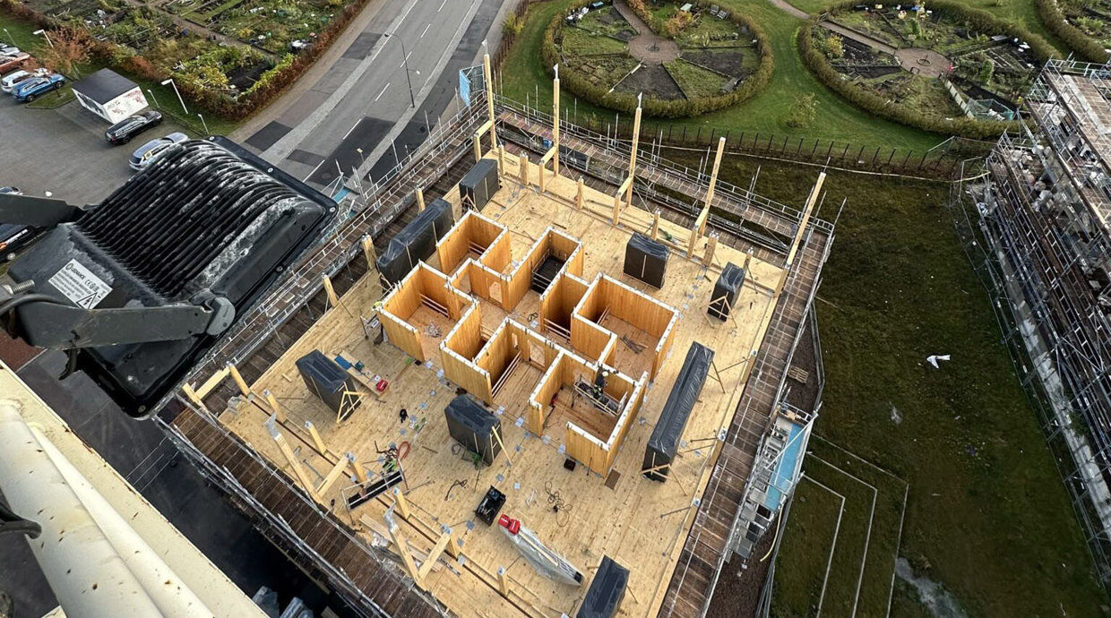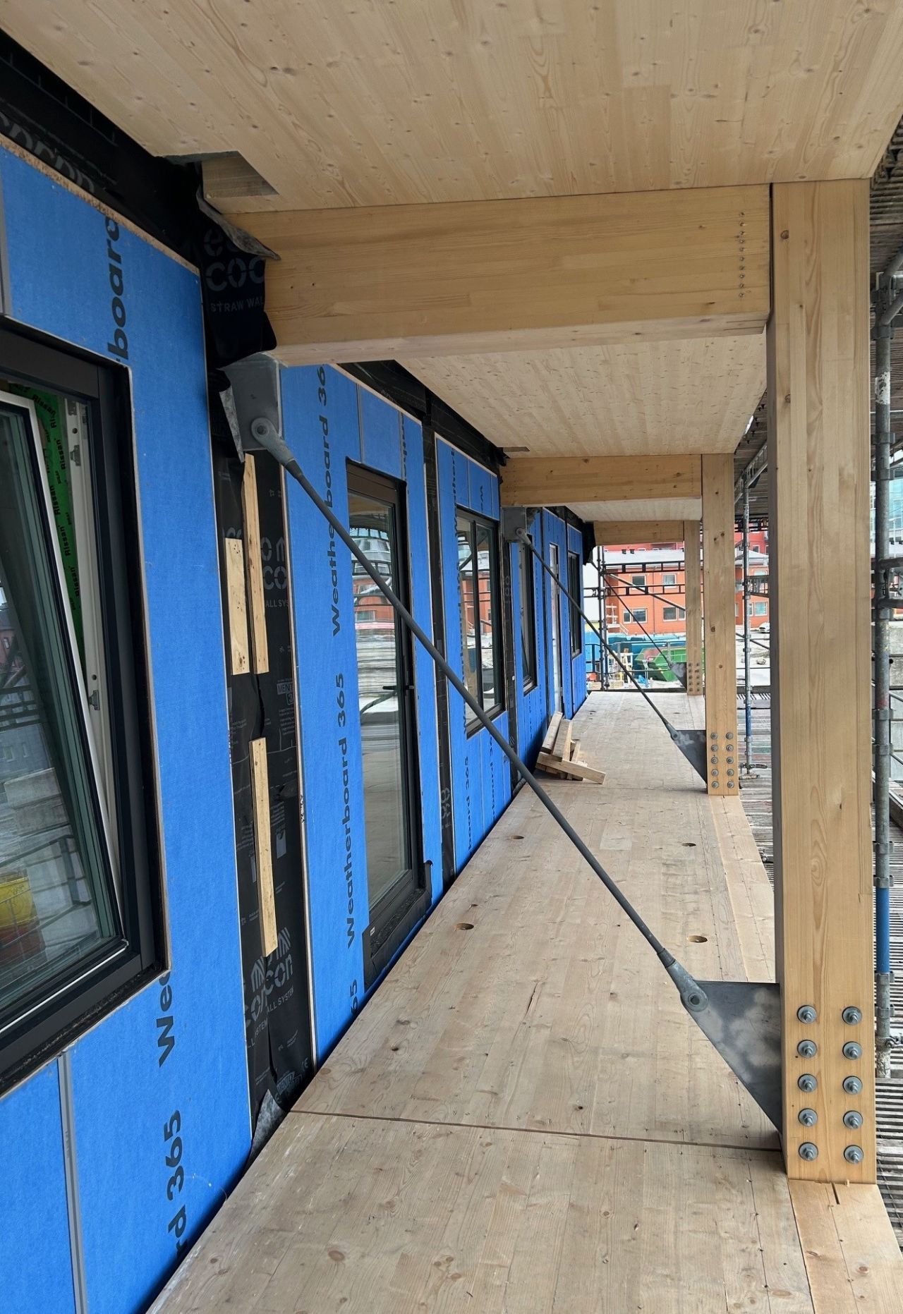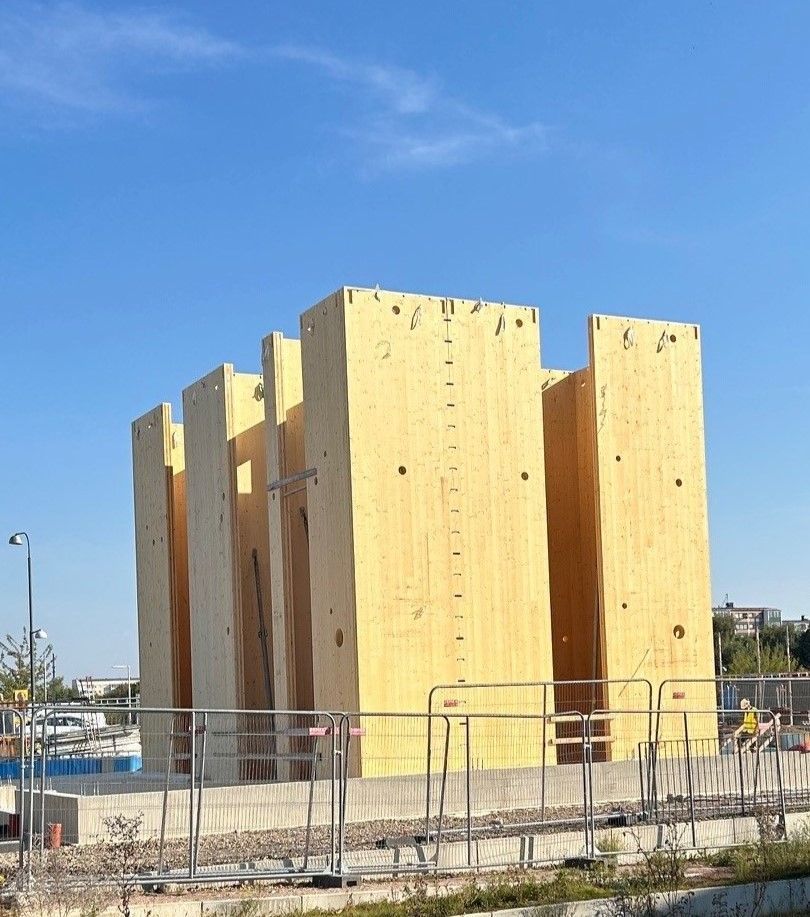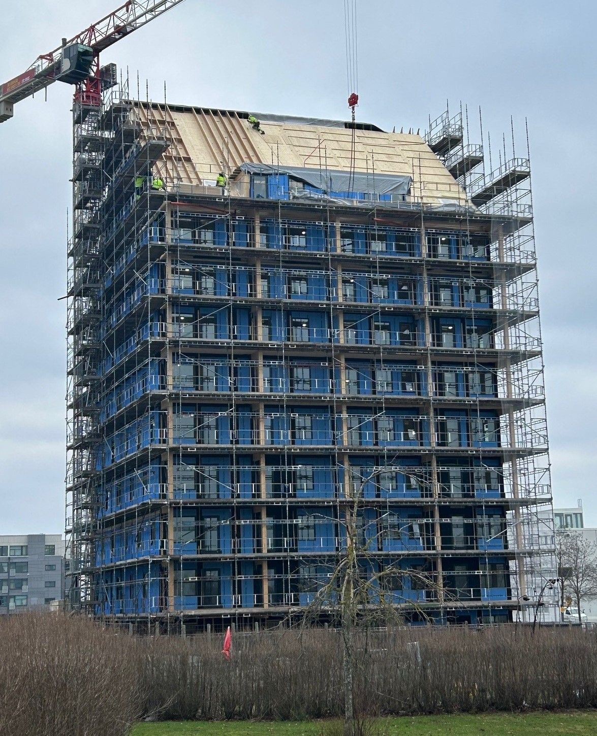 Ein Novum bei einem Hochhaus und ziemlich ungewöhnlich ist die Dämmung der Außenwände. Dafür wird industriell verdichtetes Stroh eingesetzt – um den Anspruch des Investors an Nachhaltigkeit zu erhöhen. Mit Stroh von EcoCocon soll der Einsatz von Holz reduziert werden. Die Wandelemente kommen aus dem Werk der Baufirma ETC Byggentreprenads in Hultsfred. Die Holzbaumontage erfolgte innerhalb von 4,5 Monaten.