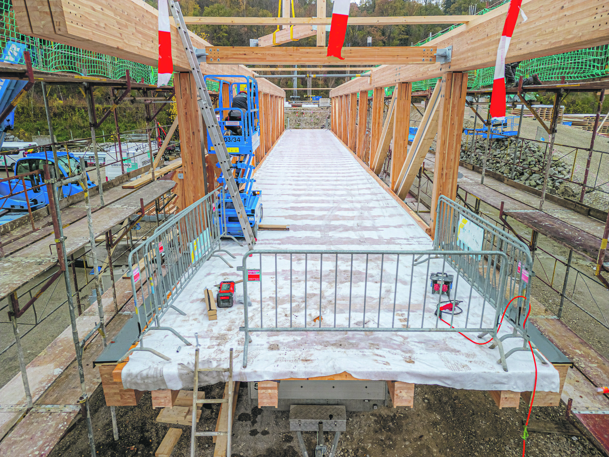 Baustart (1. Spatenstich) war Anfang September 2024. Das Brückentragwerk besteht aus drei 40 m langen Segmenten aus insgesamt 400 m³ Holz (Lärche) und 65 t Stahlteilen. Die 5,60 m breiten und 5,80 m hohen Segmente wurden von Mitte Oktober bis Anfang November bei DREIHANS GmbH Holzbau in Ulrichsberg (Mühlviertel) vorgefertigt, anschließend mit Sondertransporten auf das Gelände des zentralen Betriebsgebäudes (ZBG) der Stadt Wels angeliefert, vor Ort endmontiert und schließlich auf Pontons eingeschwommen und auf den Pfeilern abgesetzt.