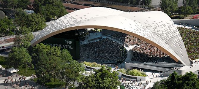 Die bisherige Freiluftbühne im Hastings Park, 1960 gebaut, war für maximal 7.500 Personen ausgelegt. Auf künftig rund 12.000 m² unter Dach sollen dann 60 bis 70 Shows, Konzerte und Public Viewings mit 1.500 bis 10.000 Zuschauern möglich werden - unabhängig vom Wetter, denn in Vancouver regnet es oft. Der Bauplatz grenzt an den PNE-Vergnügungspark „Playland“ an. Pacific National Exhibition (PNE) ist ein gemeinnütziges Unternehmen der Stadt, die in das neue PNE-Amphitheatre 65 bis 70 Mio. Can-$ investiert. Als Generalunternehmer ist EllisDon beauftragt, die Stahl- und die Holzbau-Montage führt die Walters Group durch.