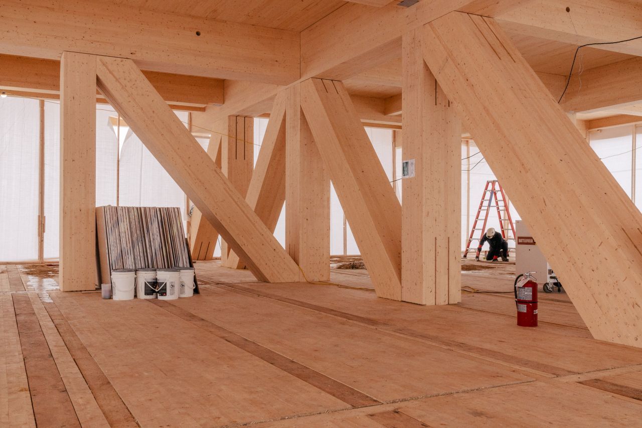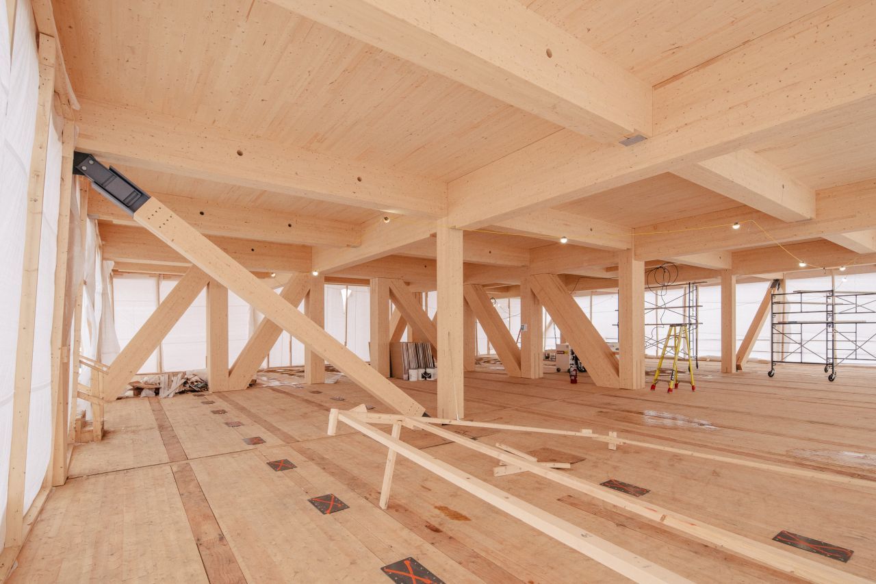 Möglich wurde das Projekt durch die Investition der Bundesregierung in Höhe von 10,2 Mio. CAD und eine weitere der Provinz Québec von rund 1 Mio. CAD. Die Bauarbeiten sind 2025 unter der Regie von der SAJO Inc. als GU angelaufen, unterstützt von NHB Construction Inc. bei der Montage. Die Tragwerksplanung lieferte Latéral, die Holzbaukomponenten kommen von Ambiance Bois Structures mit Brettschichtholz aus der Produktion von Nordic Structures.
