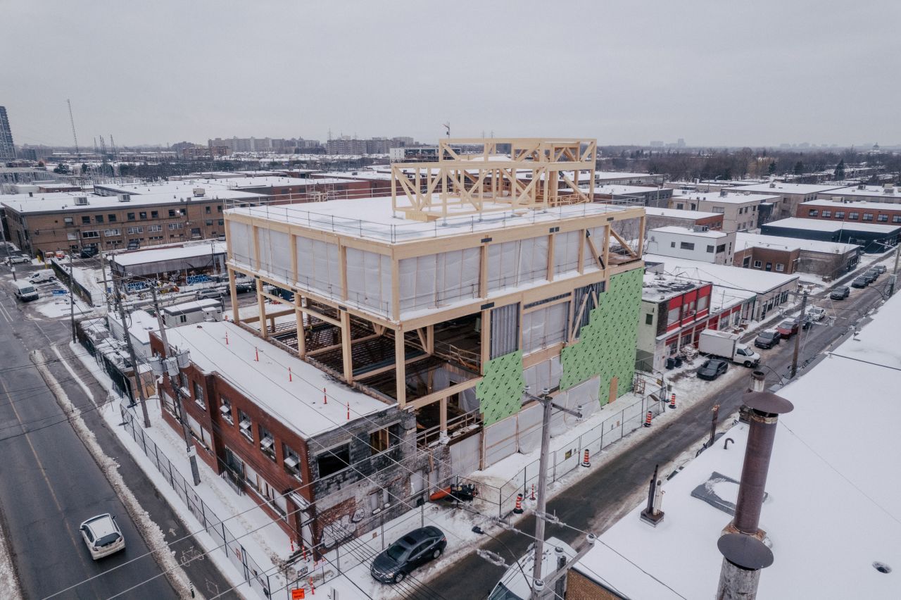 Heraus gekommen ist ein hybrider Entwurf mit ökologischem Ansatz, der darauf abzielte, den CO₂-Fußabdruck des Projekts möglichst gering zu halten. Gleichzeitig ermöglichte er mit viel Sichtholz und vergrößerten Spannweiten eine einladende Umgebung, die in Montreal neue Maßstäbe für Begegnungsräume für Kunst und Handwerk setzt. Eine besondere Herausforderung stellte dabei die Einbindung des erhaltenswerten Bestands und wieder verwendbarer Teile der ursprünglichen Struktur in die Holzkonstruktion dar.