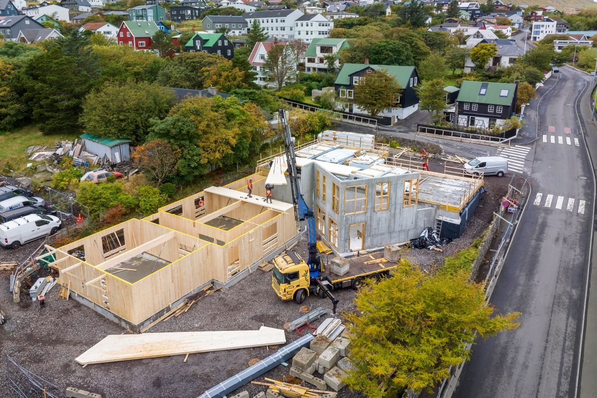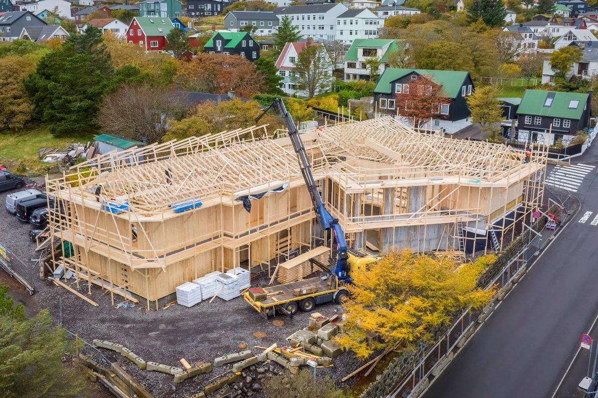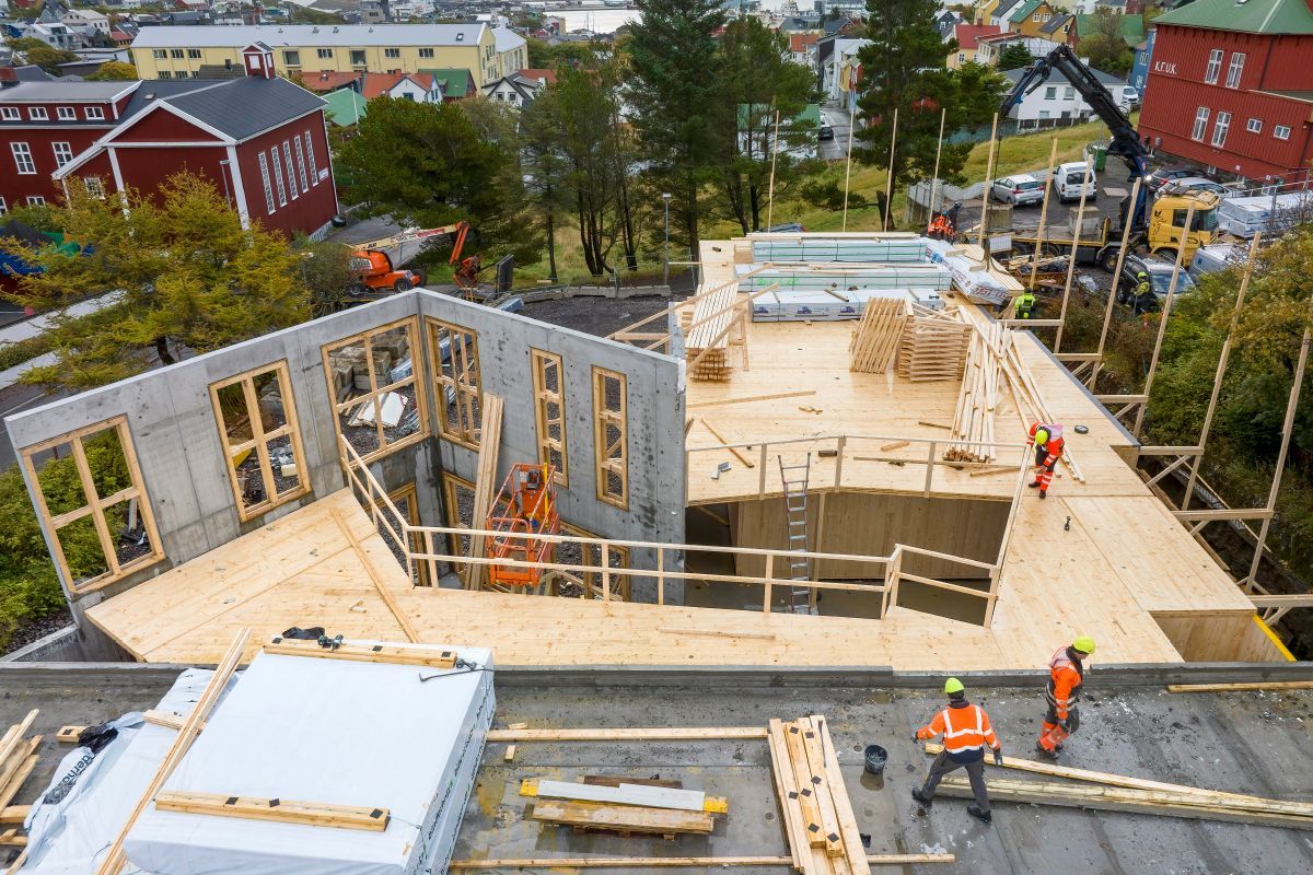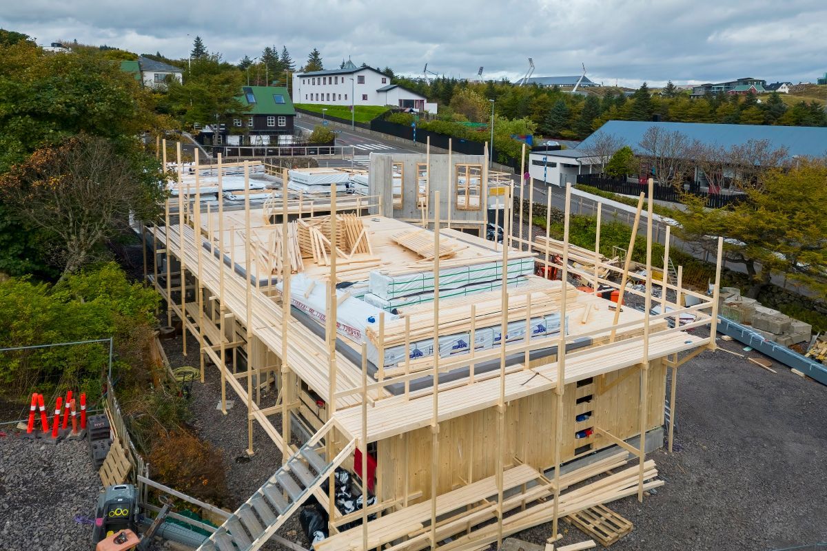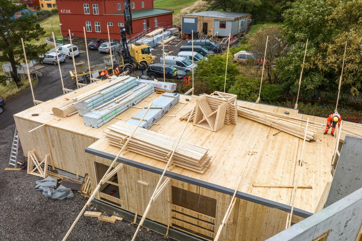 Die Sankta Frans Schule im Zentrum von Torshavn hat in diesem Jahr einen Erweiterungsbau aus vorgefertigten Brettsperrholzelementen (CLT) erhalten. Die 1.150 m² große, zweigeschossige Schulerweiterung wurde in diesem Jahr im Auftrag der Gemeinde Torshavn von der färingischen Baufirma HVT ausgeführt und nach den Sommerferien in Betrieb genommen. Die Elemente wurden über Bygma Balslev, einen Baustoffhändler auf den Färöer, bezogen und bei PROFILE A/S in Rødekro (bei Aabenraa, Südjütland) hergestellt. Die Färöer sind ein autonomer Teil Dänemarks.