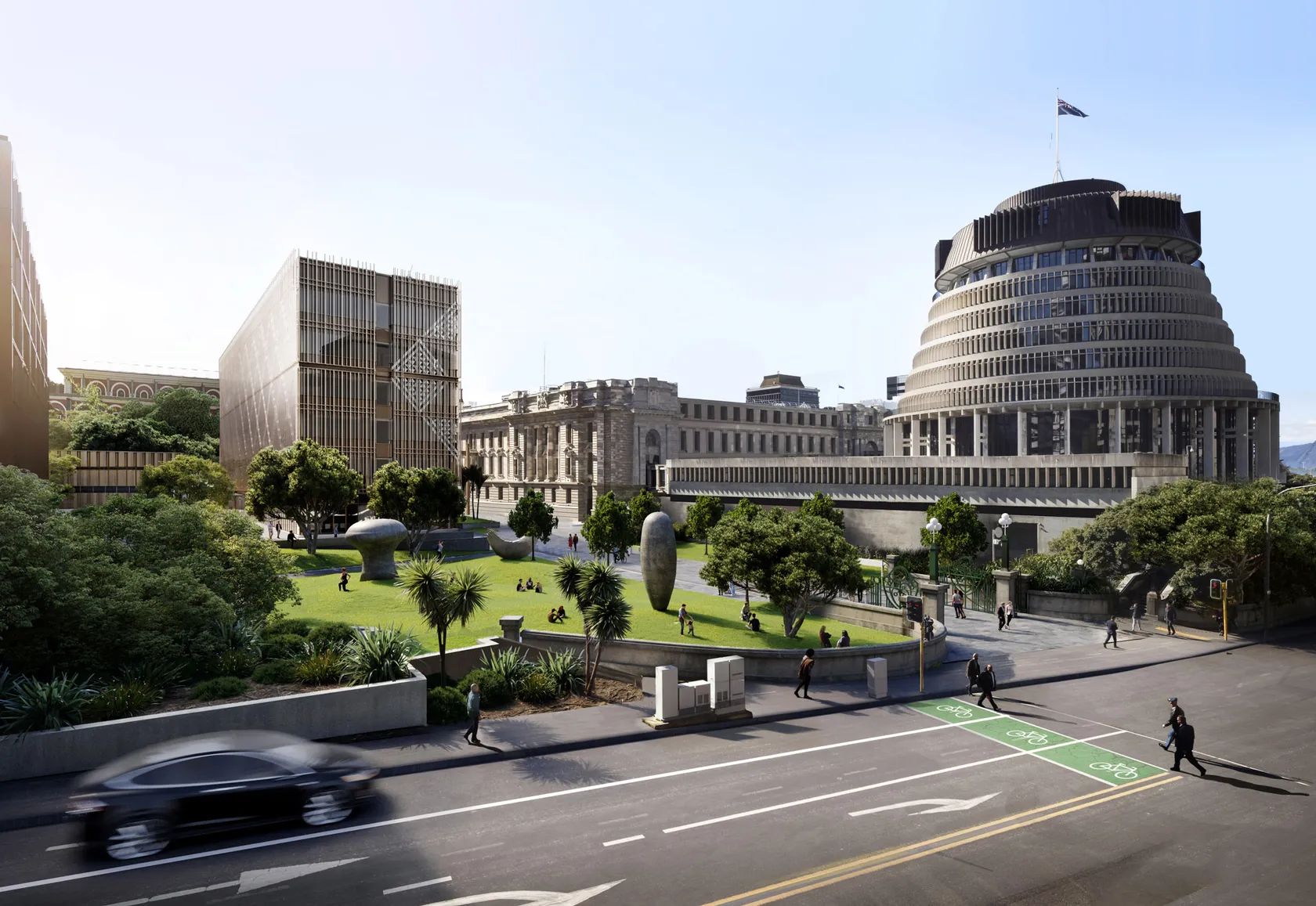 Das neue sechsgeschossige Dienstgebäude, dass der Parliamentary Service für rund 600 Regierungsmitarbeiter und Parlamentarier in der Hauptstadt erstellt (Projektname „Museum Street Building“), soll effizientere Verwaltungsstrukturen unterstützen und den Beschäftigten bessere Arbeitsbedingungen geben. In der Bedeutungskategorie IV soll der Neubau gewährleisten, dass die Handlungsfähigkeit der Institution im Krisen- und Katastrophenfall erhalten bleibt. Das Gebäude wurde von seinen Planern Studio Pacific Architecture (SPA) und Holmes Group nach den Prinzipien des Low-Damage-Designs entworfen und bekam hoch leistungsfähige Basis-Isolatoren und Dämpfer. Wegen seiner Zähigkeit unter Belastung rückte Holz als Baustoff für das Tragwerk in den Vordergrund.