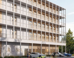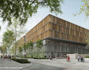Im Herzen der Waldsiedlung entsteht eine moderne, zweigeschossige Grundschule mit integrierter Sporthalle. Das Projekt verbindet Naturverbundenheit mit innovativer Holzbauweise. Das teilweise unterkellerte Gebäude verfügt im Erdgeschoss über eine Mensa, Verwaltungsräume, ein Lehrerzimmer und Klassenräume. Im Obergeschoss befinden sich Cluster mit Gruppen- und Klassenräumen. Ein offener Eingangsbereich mit Sitztreppe fördert die Begegnung. Die Gründung, der Keller, die Treppenhäuser und die Sporthalle werden massiv ausgeführt. Das Tragwerk besteht aus einem Stützen-Unterzug-System aus Brettschichtholz (BSH), das über die massiven Kerne ausgesteift wird. Dadurch sind nur wenige aussteifende Wände nötig, was die gewünschte Flexibilität schafft. Die Rippendecken aus nachgiebig verbundenen BSH-Rippen und BSP-Platten haben Spannweiten bis acht Meter. Die nicht tragenden Außenwände sind als Holztafelbauwände mit großen Fenstern geplant. Das teilweise begrünte Dach wird mit einer PV-Anlage ausgestattet. Unsere Nachhaltigkeitsplanung legt den Fokus auf ökologische Materialien, effizienten Materialeinsatz und ein optimales Raumklima.