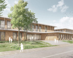 Im Herzen der Waldsiedlung entsteht eine moderne, zweigeschossige Grundschule mit integrierter Sporthalle. Das Projekt verbindet Naturverbundenheit mit innovativer Holzbauweise. Das teilweise unterkellerte Gebäude verfügt im Erdgeschoss über eine Mensa, Verwaltungsräume, ein Lehrerzimmer und Klassenräume. Im Obergeschoss befinden sich Cluster mit Gruppen- und Klassenräumen. Ein offener Eingangsbereich mit Sitztreppe fördert die Begegnung. Die Gründung, der Keller, die Treppenhäuser und die Sporthalle werden massiv ausgeführt. Das Tragwerk besteht aus einem Stützen-Unterzug-System aus Brettschichtholz (BSH), das über die massiven Kerne ausgesteift wird. Dadurch sind nur wenige aussteifende Wände nötig, was die gewünschte Flexibilität schafft. Die Rippendecken aus nachgiebig verbundenen BSH-Rippen und BSP-Platten haben Spannweiten bis acht Meter. Die nicht tragenden Außenwände sind als Holztafelbauwände mit großen Fenstern geplant. Das teilweise begrünte Dach wird mit einer PV-Anlage ausgestattet. Unsere Nachhaltigkeitsplanung legt den Fokus auf ökologische Materialien, effizienten Materialeinsatz und ein optimales Raumklima.