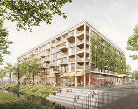 mehr lesenDer Beitrag konnte sich gegen über 40 Projekte durchsetzen und wurde von der Jury zur Weiterbearbeitung empfohlen. Das Holztragwerk zeichnet sich durch ein einfaches und durchgängiges Stützen-Unterzugsystem aus. Die Decken sind als Holz-Beton-Verbundkonstruktion geplant.
